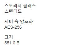그리고 AES-256을 선택 후 저장을 선택하면 선택된 객체 모두 암호화를 진행합니다. 암호화된 객체를 다운로드하면 복호화 하여 다운로드 하기 때문에 암호화 된 상태인지 확인할 수 없습니다. 암호화된 객체를 선택하여 개요 부분을 확인하면 아래와 같이 적용된 부분을 확인할 수 있습니다.