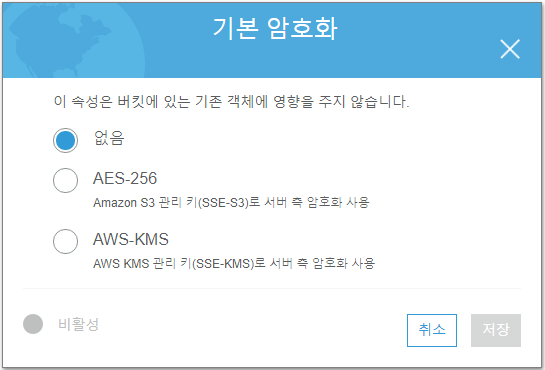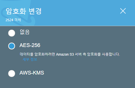 KMS를 선택하면 원하는 키를 선택할 수 있습니다만.. 키 관리하고 https로만 처리되어야 하는 여러 번거로움 때문에 사용하지는 않았습니다.