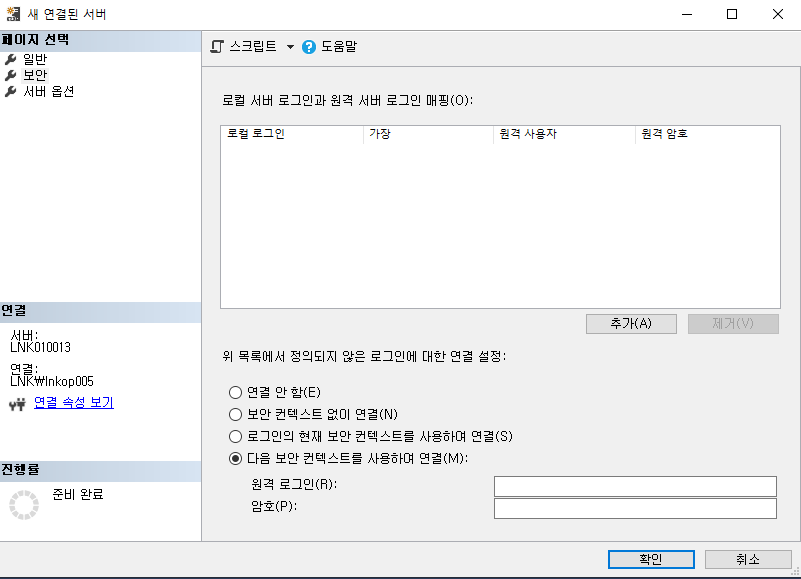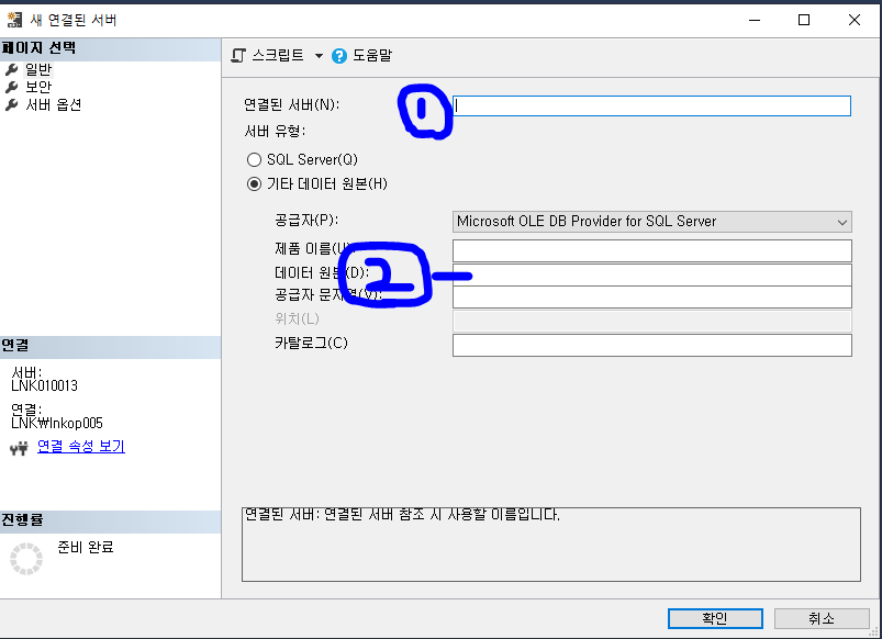 (1) 에 사용할 이름을 설정, (2)에 연결할 DB의 IP, PORT를 입력합니다. MSSQL 끼리 연결할 때 다른 설정은 굳이 입력하지 않아도 됩니다. 연결할 DB에서는 "보안" 항목에 입력할 계정에 필요한 권한이 설정되어 있을 것이므로 (입력된 것이 없다면 연결할 DB에 계정 생성, 필요한 사용 권한 설정을 해 두시면 됩니다.) 다른 설정은 필요없습니다. 카탈로그에 사용할 DB 이름을 넣을 수 있지만 사용 권한 설정에 필요한 정보가 다 있으므로 입력이 불필요합니다.