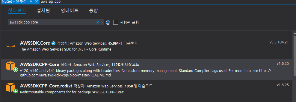 Windows에서는 GitHub( https://github.com/aws/aws-sdk-cpp )에서 직접 다운받아 빌드를 하기보다는 NuGet으로 손쉽게 설치해서 사용하길 권합니다. (VS 2017에서는 문제가 없으나 2019에서는 동적 dll linking 에러가 발생합니다. VS 2019를 사용하시는 분들은 aws.amazon.com/ko/blogs/korea/aws-c-plus-sdk-in-windows-visual-studio/를 참고하여 정적 라이브러리로 빌드해서 사용하세요.)