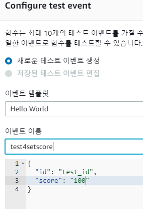 우선 nodejs를 사용해 setScore라는 이름의 람다 함수를 하나 만듭니다.