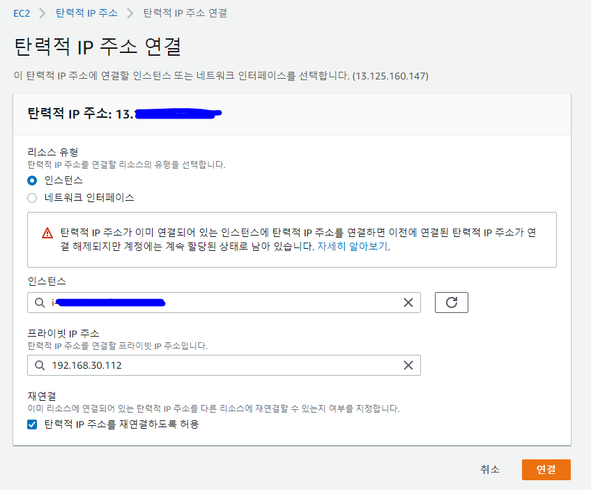 "탄력적 IP"라는 메뉴를 선택한 후 "탄력적 IP 주소 할당" 버튼을 선택하여 퍼블릭 주소를 하나 할당합니다. 그리고 "Actions" 버튼을 눌러 "탄력적 IP 주소 연결"을 선택한 후 생성한 인스턴스에 연결해 줍니다.
