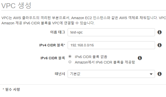 우선 VPC 탭에서 "VPC 생성" 버튼을 누릅니다. "이름 태크"에는 "test-vpc"로 명명하겠습니다.