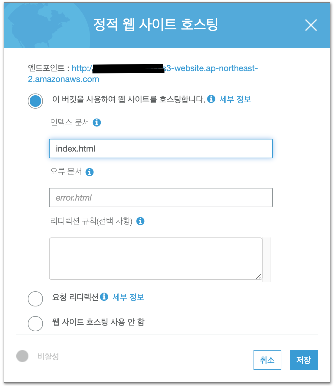 생성이 되었다면 버킷의 "속성" 탭으로 가서 "정적 웹 사이트 호스팅" 을 선택 후 아래와 같이 설정합니다. 해당 탭의 상단에 있는 엔드포인트는 여러분의 컨텐츠로 접근할 수 있는 주소입니다. html 컨텐츠를 업로드 후 이 주소로 접속하여 확인할 수 있습니다. 개인적으로 사용하거나 제한된 용도로 사용할 때는 별도의 도메인 설정없이 이 endpoint만을 사용할 수도 있습니다.