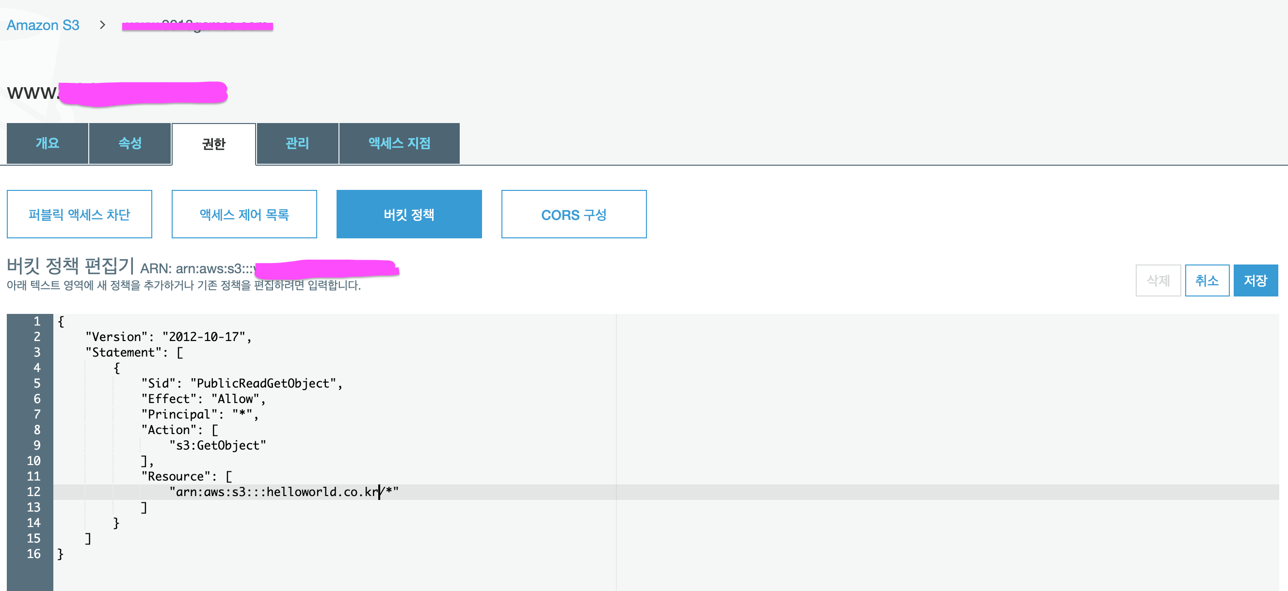 파일 업로드를 할때마다 이렇게 지정할 수도 있지만 버킷의 정책을 변경하는 방법도 있습니다. 버킷의 "권한" -> "버킷 정책"을 눌러 아래 정책을 복사해서 넣고 저장하시면 helloworld.co.kr 에 업데이트되는 모든 컨텐츠를 누구나 읽을 수 있게 됩니다.