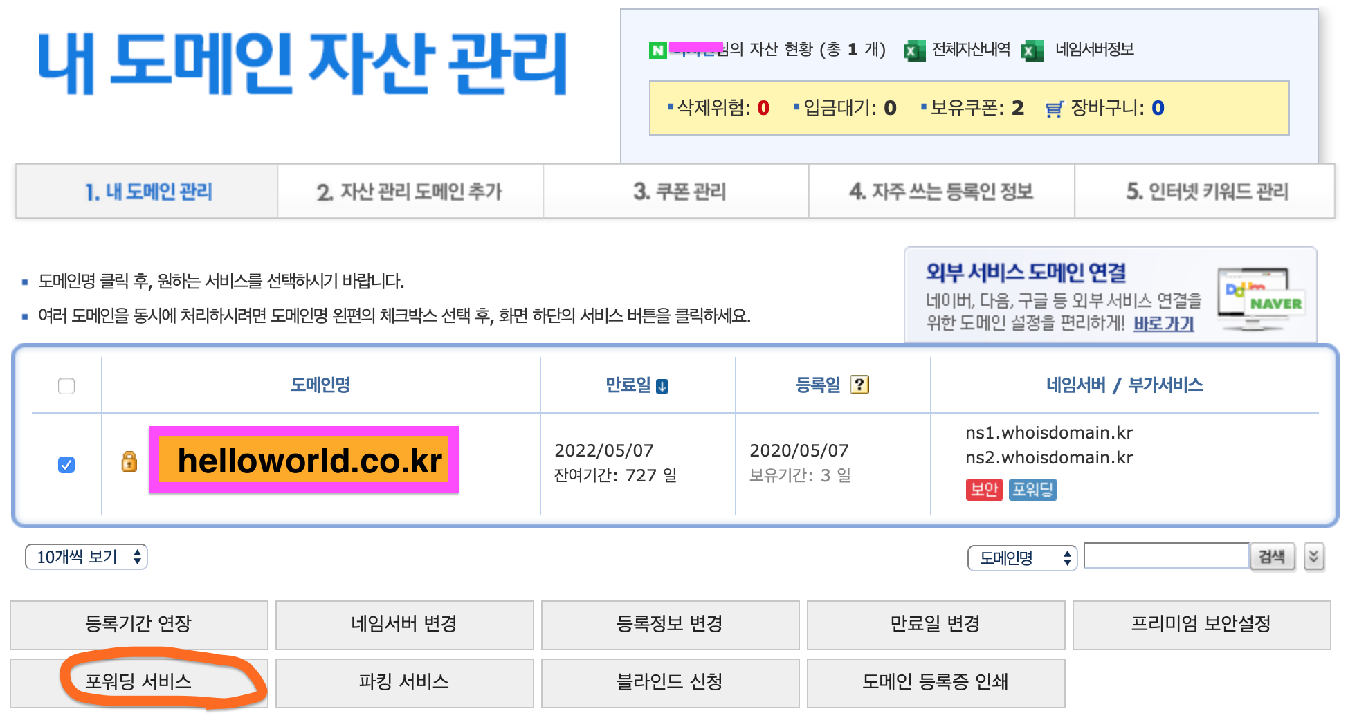 다시 whois로 돌아가 "내 도메인 자산 관리" 화면에서 "루트 도메인 버킷"으로 연결할 도메인을 선택 후 화면 하단의 "포워딩 서비스"를 선택합니다.