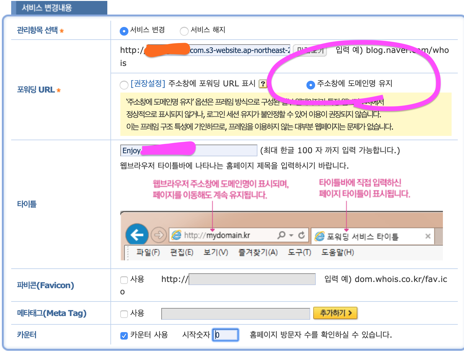 "루트 도메인 버킷"의 엔드 포인트를 복사해 포워딩 URL에 복사해서 넣은 후 "주소창에 도메인명 유지"를 선택해야 합니다.