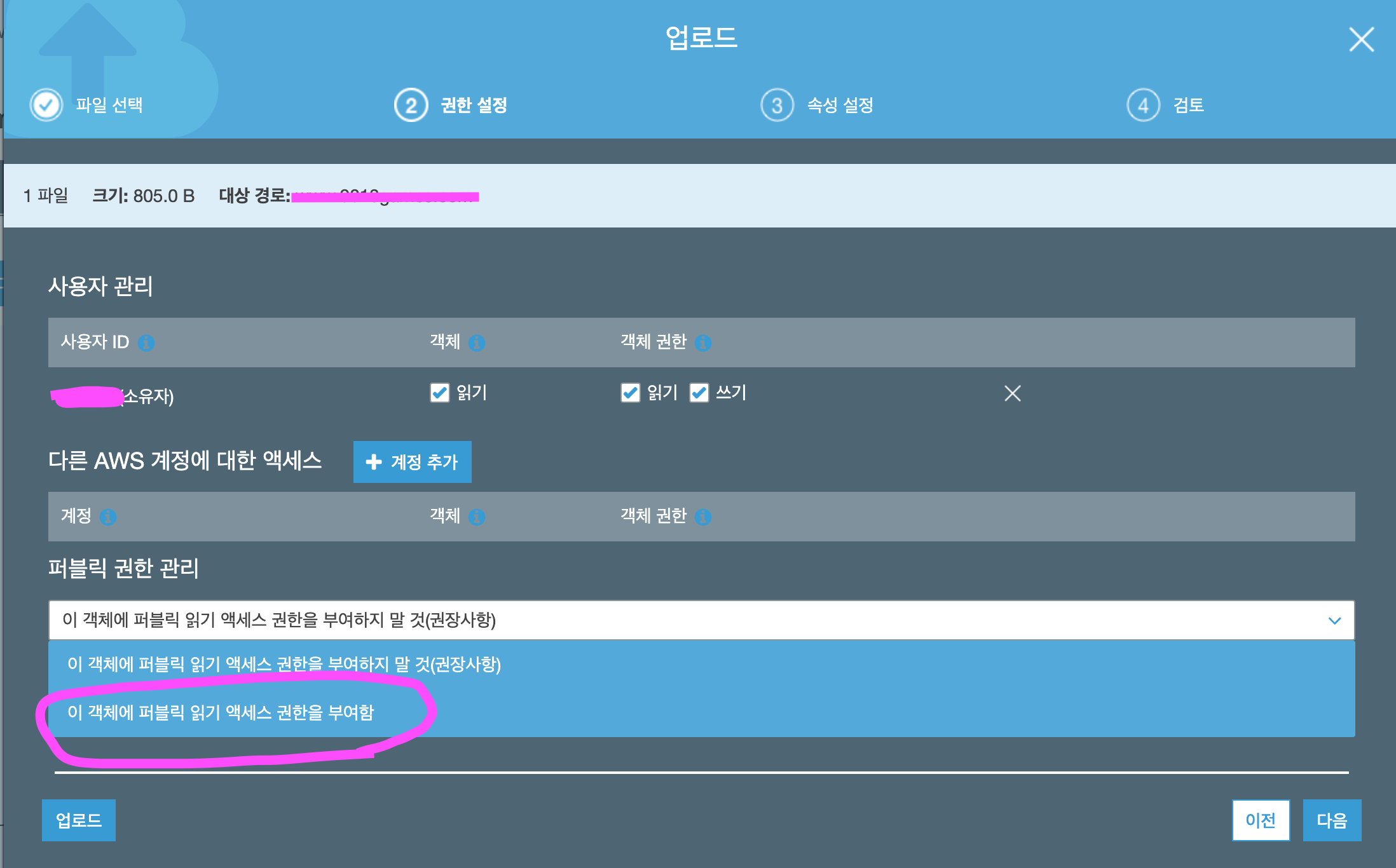 파일 추가 후 "다음" 버튼을 누르고 속성 중 "퍼블릭 권한 관리"에서 "이 객체에 퍼블릭 읽기 엑세스 권한을 부여함"을 선택 후 "업로드"버튼을 선택하여 컨텐츠 업로드를 완료합니다.