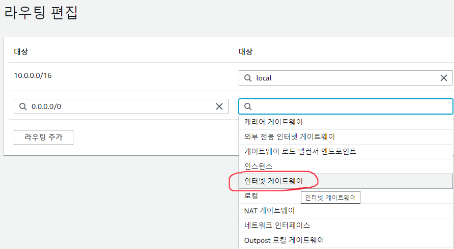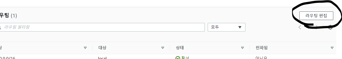 다시 라이팅 테이블 화면에서 연결하려는 EC2에 연결된 VPC와 연결된 "라우팅 테이블 ID"를 선택 후 화면 하단의 "라우팅 편집" 버튼을 누르고,