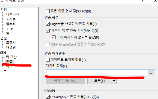 이제 putty에서 Auth에 다운받은 ppk 파일을 설정합니다.