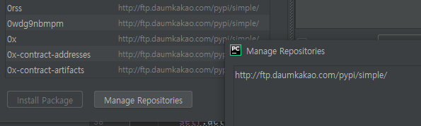 만약 패키지 리스트가 안보인다면 하단의 "Manage Repositories"를 눌러 설정된 저장소를 삭제 후 "http://ftp.daumkakao.com/pypi/simple/"를 추가해 주세요.