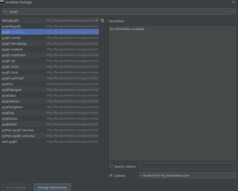 원하는 패키지를 선택 후 우측 하단의 "Options" 버튼을 눌러 활성화 후 --trusted-host ftp.daumkakao.com 을 입력 후 인스톨 버튼을 누르시면 원하는 패키지를 정상적으로 설치하실 수 있습니다.