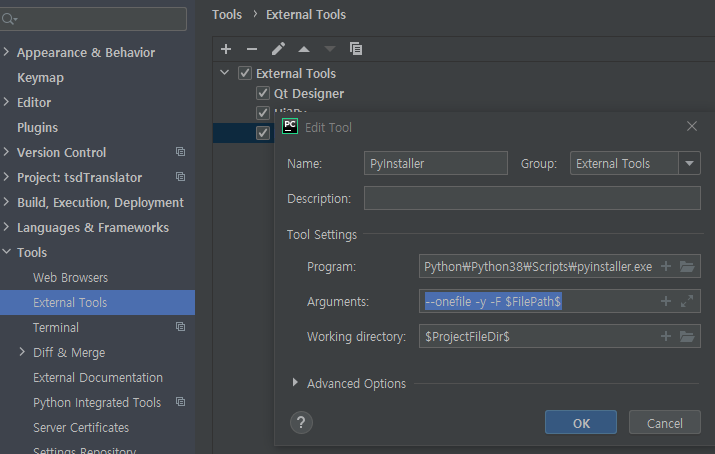 Arguments에 --onefile --windowed $FilePath$ 입력 (콘솔 응용 프로그램일 경우 --windowed 옵션을 삭제하시면 됩니다.)