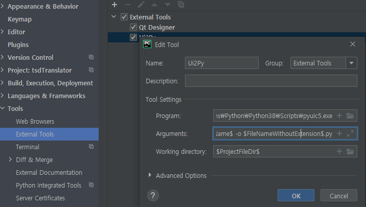 Arguments에 $FileName$ -o $FileNameWithoutExtension$.py 입력
