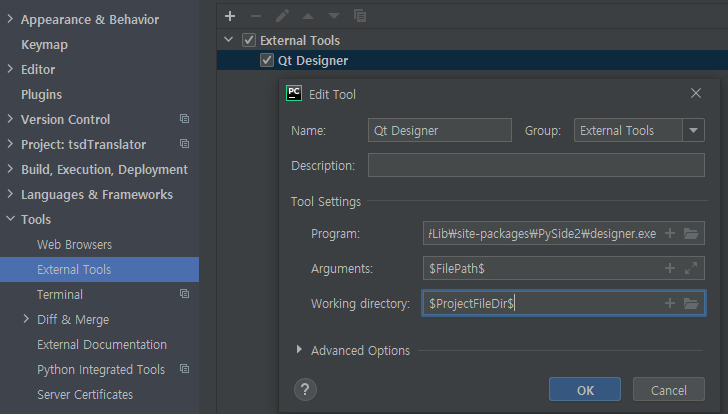 File -> Settings -> Tools -> External Tools 에서 + 아이콘을 눌러 툴을 설정합니다.
