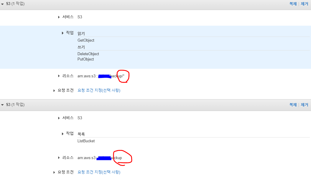 S3 Bucket 접근 시 권한을 설정할 때 Bucket에 대한 권한인지 Object에 대한 권한인지에 따라 아래 스샷처럼 별도 설정이 필요하다.