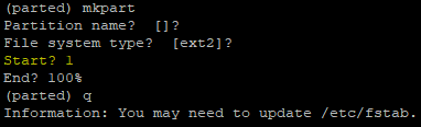 (* mkpart의 Start 와 End는 지정하는 파티션의 사용 용량 범위를 지정하는 것이며 숫자만 기록할 경우 MB가 기본이며 %로도 입력할 수 있습니다.)