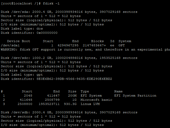 현재 인식된 장치sda, sdb 가 각각 2TB , sdc가 1TB 입니다. 이 중 OS를 위해 사용되는 sdc는 disk label type이 gpt로 설정되어 있고, raid0로 인식되어 사용중인 sda의 disk label type은 dos로 sdb는 disk label type이 별도 출력이 되어 있지 않습니다.