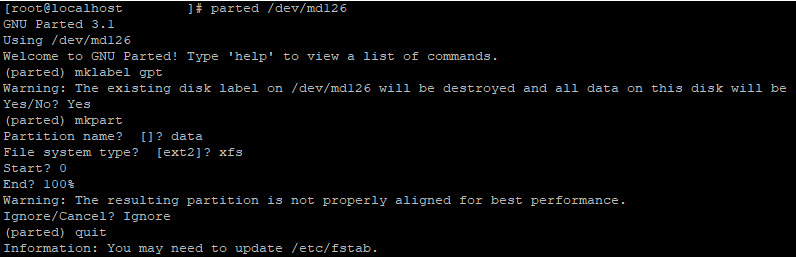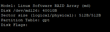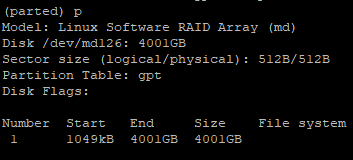parted -l 로 현재 상태를 검색해보니 아래와 같이 출력됩니다. (나머지 부분은 생략하고 하단의 raid 디바이스에 대해서만 캡쳐했습니다.)