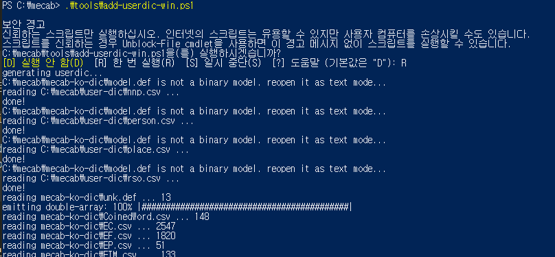 이제 사전 빌드 스크립트를 실행할 준비가 되었습니다. toos/add-userdic-win.ps1 을 실행해 user-dic 폴더의 내용을 빌드합니다.