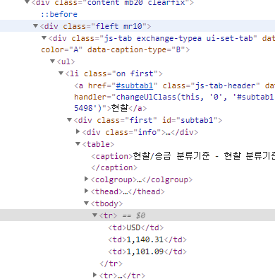 html 코드를 로딩 후 "div.exchange-typea ul" 하위의 "tbody tr" 코드를 검색하면