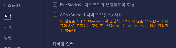 1. 우선 bluestack의 설정에서 ADB 사용을 활성화 합니다.
