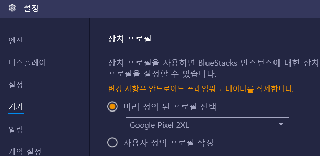 "기기" 옵션에서 어떤 모델을 에뮬레이션 할지 선택할 수 있습니다.
