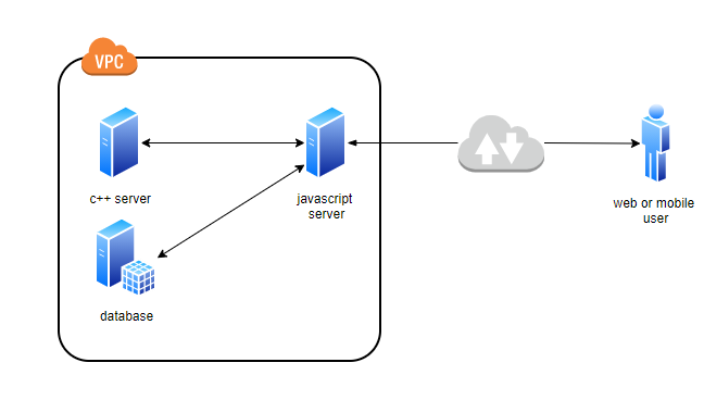 최종 사용자는 제공된 웹 앱 혹은 모바일 앱에서 wss로 javascript server에 연결하여 인증과 기타 필요한 작업을 요청합니다. 그리고 javascript server는 VPC 내부의 서버에 socket으로 연결합니다. c++ server 입장에서는 javascript server를 위해 준비할 사항은 추가적인 패킷 정의 뿐입니다.