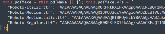 pfdmake.js(.min.js), vfs_fonts.js에 실질적인 폰트 데이터가 들어가 있는 것을 확인하실 수 있습니다.
