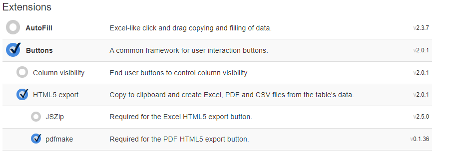 DataTables을 다운받으실 때 해당 사이트에서 Extensions을 선택할 수 있으며, 이중 pdfmake를 선택할 수 있습니다.