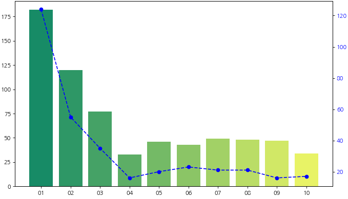 ax2.plot(xtick_label_position, values2, color=color, linestyle='--', marker='o') ## 선 그래프
