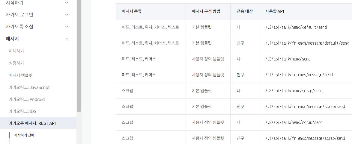 메세지와 관련된 API 리스트는 공식 개발자 문서에서 "문서" -> "메세지" -> "카카오톡 메세지:REST API"의 "선택 조건에 따른 API" 항목에서 확인할 수 있습니다.