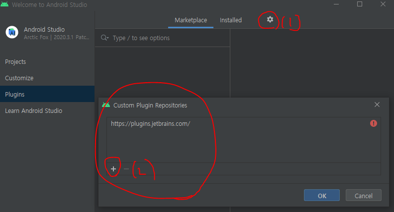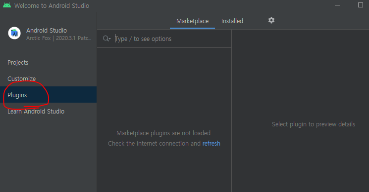 Android Studio 설치 (https://developer.android.com/studio , 아래에서는 2020.3.1 버전) 후 Plugins 화면으로 이동.