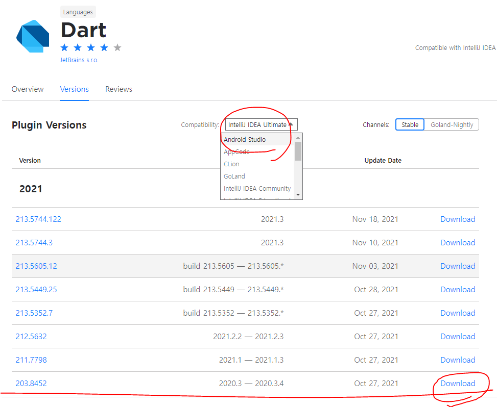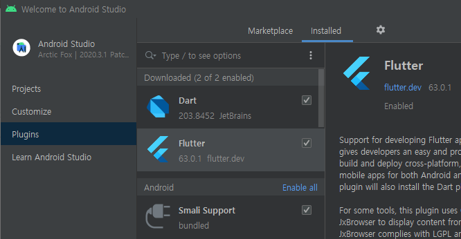Android Studio 빌드 버전은 2020.3.1입니다. 플러그인 다운받을 때 203.x 버전을 다운받아야 합니다.