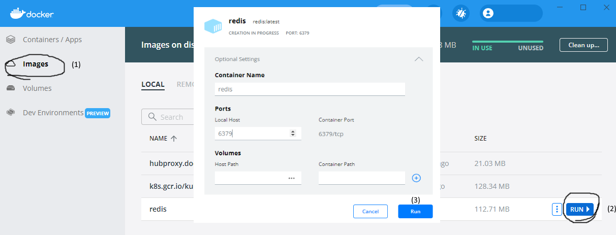 지정된 Remote Repositories가 없다면 cmd 창에서 docker pull redis:latest를 실행하면 images에서 바로 보입니다. (2)의 run 버튼을 클릭하면 실행 옵션창이 뜨며, container name과 Port forwarding을 위해 Ports -> Local Host아래에 연결할 포트번호를 입력합니다. 이를 입력하지 않으면 docker container 내에서만 포트가 오픈되고 로컬 PC에서 포트가 열려 있지 않아 실제로 연결이 되지 않으니 꼭 입력해야 합니다. 정상적으로 실행하면 Containers/App 화면에서 실행된 결과를 확인할 수 있습니다.