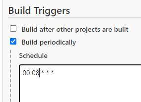 매일 오전 8시 자동 빌드를 한다고 가정하겠습니다. 항목 중 Build Triggers -> Build Periodically 를 선택 후 "00 08 * * *"을 입력합니다.