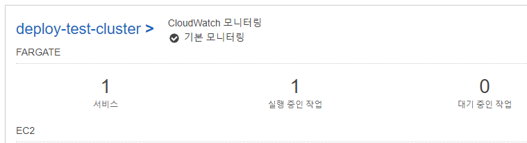 docker image가 등록되면 ecs에 등록했던 작업이 자동으로 작동되어 cluster에 fargate 한 개가 작동하는 것을 확인할 수 있습니다.