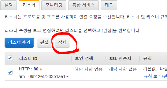이번 샘플에서는 ALB에서 하나의 규칙(80으로 받아 8000번으로 포트 포워딩)만 적용할 것이며, ALB의 기능을 전적으로 사용하지 않습니다. 그래서 위에서 설정한 ALB 기능 중 리스너 기능과 Target group 설정을 지워 비어있는 ALB를 만드세요. 생성한 로드배런서를 선택, 하단의 탭 중 "리스너" 탭을 선택해 설정된 리스너를 삭제하고, 4-2에서 생성한 대상 그룹도 삭제합니다. ECS 서비스 생성 과정 중 "2 네트워크 구성"에서 리스너와 대상 그룹을 다시 지정하게 됩니다.
