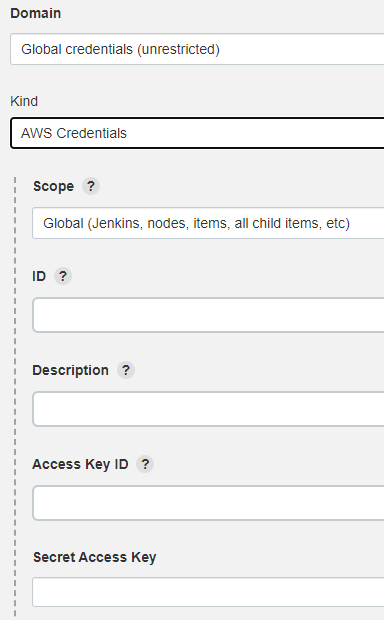 이제 본격적으로 Jenkins 설정을 진행하겠습니다. 우선 Credentials을 추가해야 합니다. Jenkins 관리 -> AWS Configuration에서 Region은 Auto로, Amazon Credentials에서 "Add"버튼을 누릅니다. "Kind"에서 AWS Credentials을 선택 후 ID에는 원하는 이름을 입력하고, 위에서 만들었던 deploy_user의 Access Key ID와 Secret Access Key값을 등록합니다.