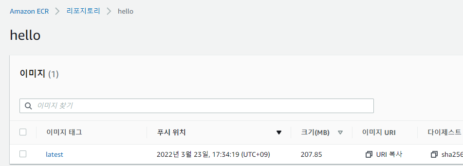 - 이미지 : ----------------.dkr.ecr.ap-northeast-2.amazonaws.com/hello (hello라는 이름으로 이미지를 업로드 한다고 가정하겠습니다.)