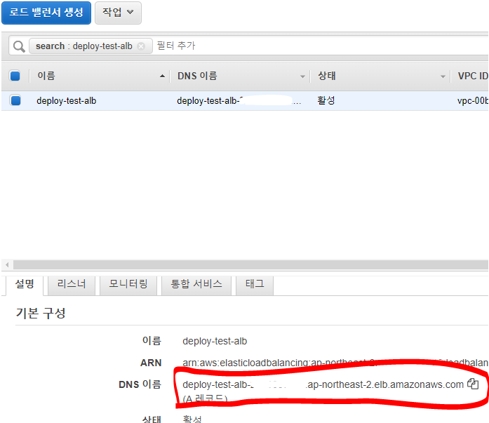 "EC2 -> 로드밸런서"로 이동하여 생성합니다. "Application Load Balancer"를 선택, 이름은 "deploy-test-alb"로 명명하고 위에서 생성한 VPC로 선택, subnet은 public으로 모두 선택, Security groups 은 위에서 80포트를 오픈한 sg를 선택합니다. 그리고 "Listeners and routing"에서 http port 80번(ALB에서 80번으로 받아 8000번으로 포트 포워딩하도록 설정합니다.), target group은 위에서 생성했던 deploy-test-tg로 설정합니다.