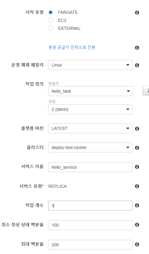 Service 생성을 시도하여 "시작 유형"에 "FARGATE", "서비스 이름"에 원하는 이름을, "작업 개수"는 서비스 초기에 실행할 인스턴스(task) 개수를 입력합니다. 여기서는 1개만 실행하도록 하겠습니다.