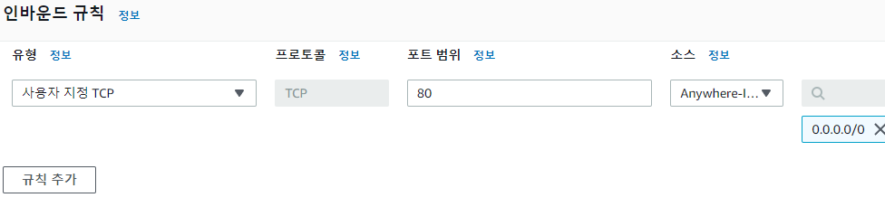"보안 그룹" -> "보안 그룹 생성"을 클릭합니다. 필요한 보안 그룹은 두 개입니다. 하나는 alb에서 유저들이 접속할 수 있는 80포트를 전체에 열어주고, alb에서 fargate task의 8000번으로 접속하는 두 가지 입니다. fargate task에 설정할 방화벽에서 source는 vpc의 CIRD를 입력해야 합니다.