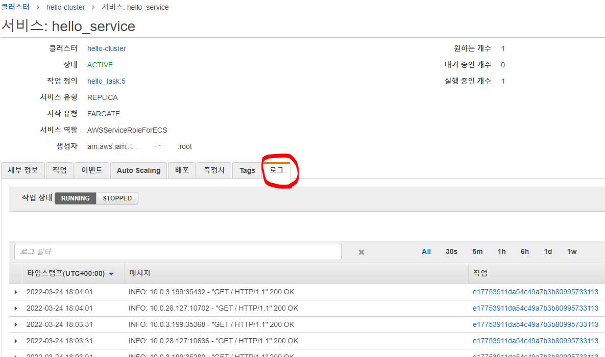 업데이트된 서비스의 로그는 ECS 클러스터 -> [클러스터명] -내부의 "로그" 탭에서 로그를 확인할 수 있습니다.