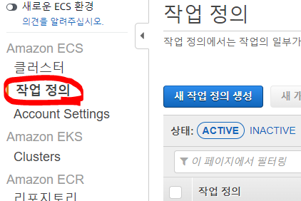 클러스터 구축 전에 등록될 도커 이미지를 배포하는 작업 정의를 합니다. 작업 정의는 ECR에 업로드된 도커 이미지를 ECS 클러스터로 배포하는 작업을 정의하는 것입니다. ECS -> 작업 정의 -> "새 작업 정의 생성" 버튼을 클릭합니다.