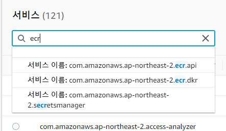 VPC의 엔드포인트화면으로 이동해서 "엔드포인트 생성"을 클릭합니다. 총 세 개의 endpoint를 생성해야 합니다. 서비스 필터링에 ecr.api, ecr.dkr, logs 를 검색하여 서비스 이름을 선택합니다. ecs 서비스가 위치할 private subnet을 설정하면 됩니다.