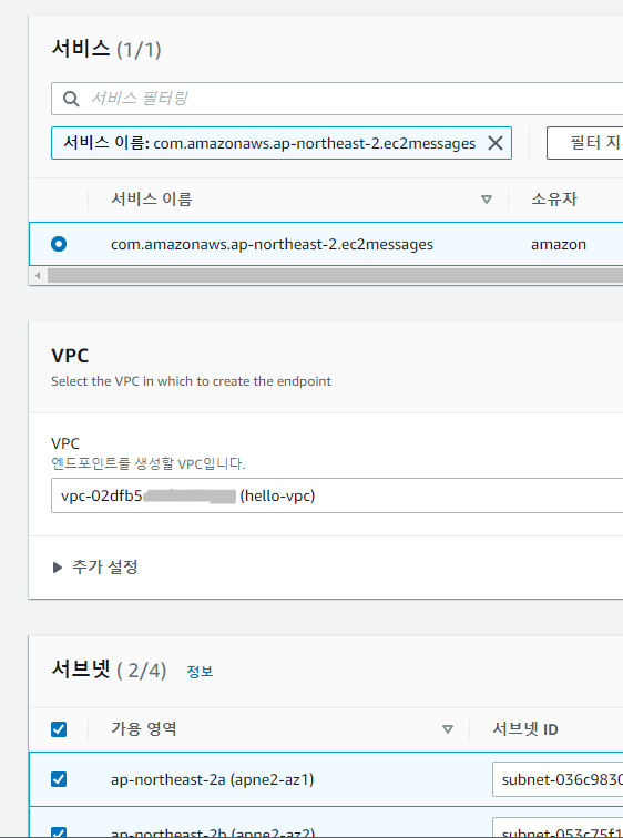 서비스를 선택 후 ssm으로 접근할 VPC와 private subnet을 선택, 보안 그룹 선택 시 443 포트 설정이 되어있는 방화벽을 선택,생성하면 됩니다.