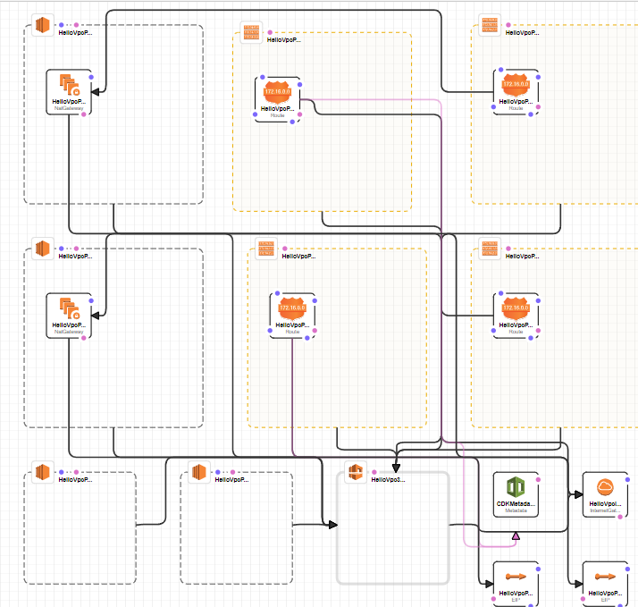 vpc에 대한 이름 하나 명시 했을 뿐인데 subnet부터 시작해서 필요한 gateway까지 모두 생성되는 것을 확인할 수 있습니다. 어떤 서비스들이 설정되었는지는 콘솔창에서 확인할 수 있으며, AWS Console -> CloudFormation -> Stack -> HelloStack의 템플릿에서 확인할 수 있습니다. 혹은 로컬 경로 cdk.out폴더 안 HelloStack.template.json파일에서도 확인 가능합니다.
