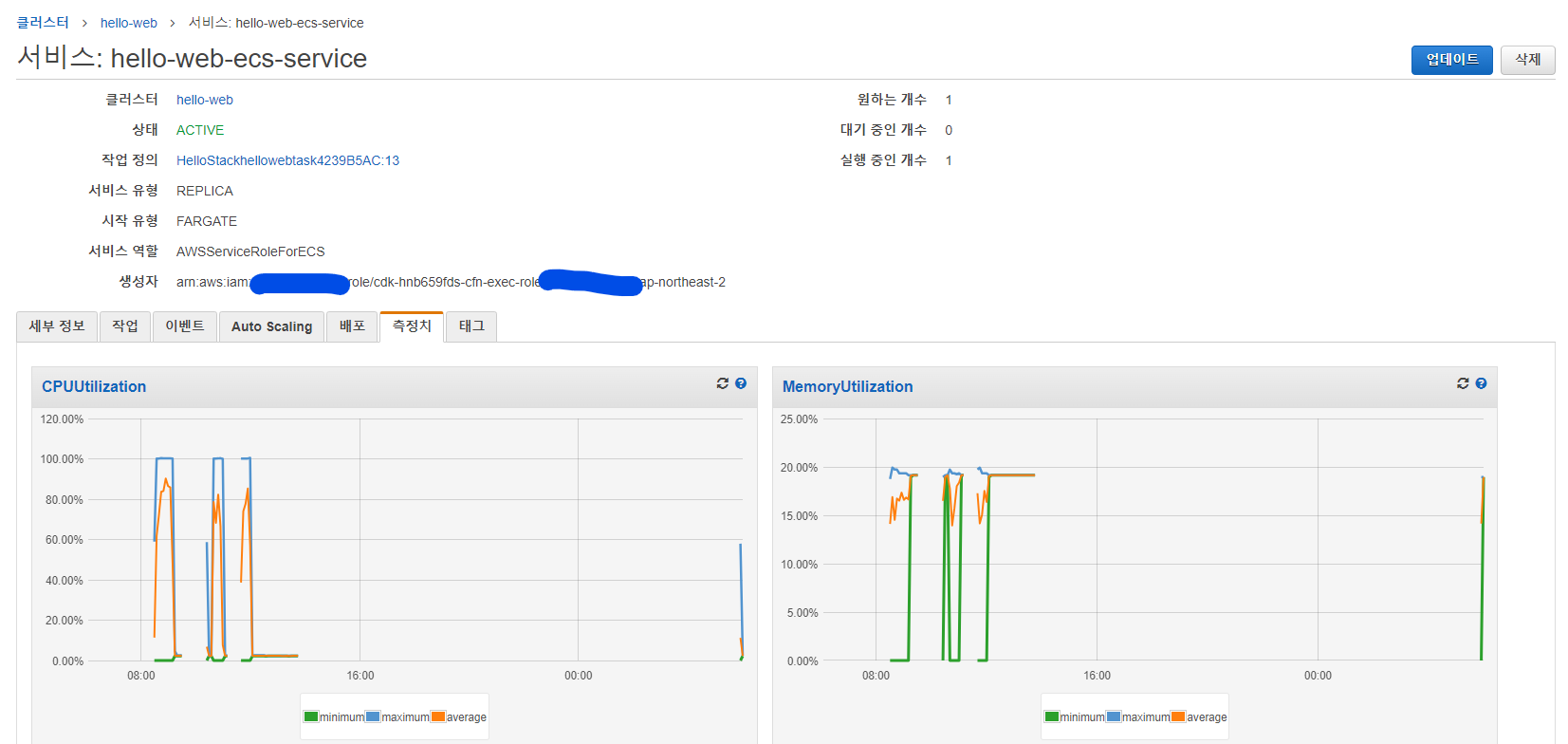 Number of users에는 최대 세션 수를, Spawn rate에는 세션 추가되는 간격을 그리고 Host에는 접속 주소(http://를 추가하여 입력)를 입력 후 "Start swarming"을 누르면 테스트가 시작됩니다. 세션 수를 50개로 입력 후 테스트 진행하면 scale out되는걸 확인할 수 있으며, cpu 증가가 미미하다면 세션을 더 추가해 보시기 바랍니다. 이제 ECS의 서비스로 가서 "측정치" 탭을 다시 확인해 보시면 CPUUtilization이 증가된 것을 확인할 수 있습니다.