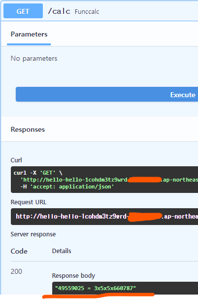 우선 ECR에 등록할 간단한 API 서비스를 만듭니다. 이 예제에서는 /calc 라는 인터페이스를 통해 랜덤한 수를 소인수분해하고 해당 결과를 돌려주도록 하는 샘플을 추가해 보았습니다. CPU 부하를 기준으로 스케일아웃을 설정할 것이므로 수초 동안 연산을 수행 후 결과를 돌려주도록 합니다.